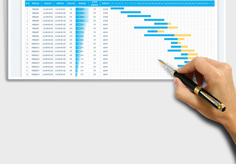 藍色項目進度甘特圖(自動進度條)Excel表格包含