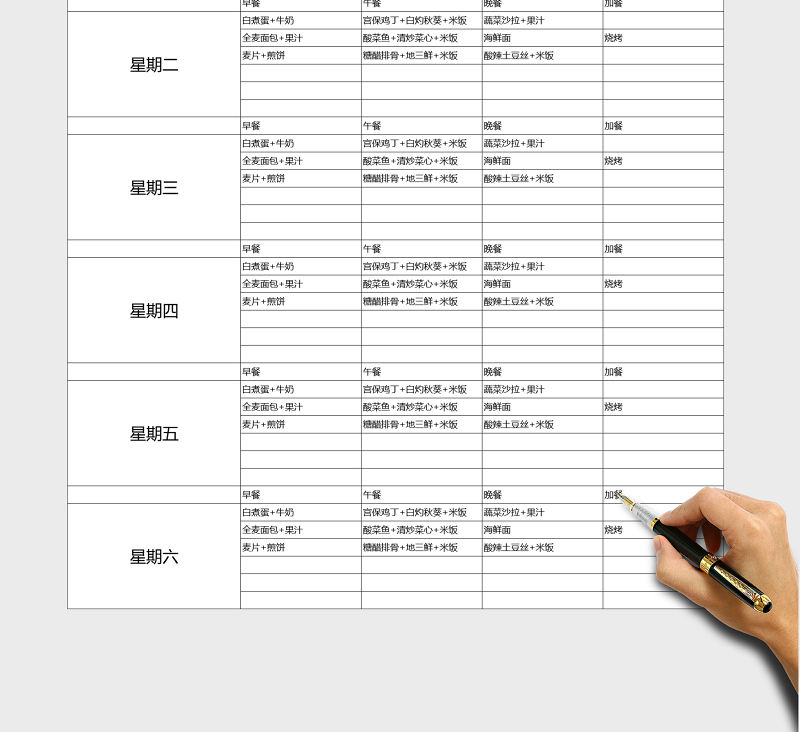 個(gè)人飲食計(jì)劃每周食譜表excel表格模板