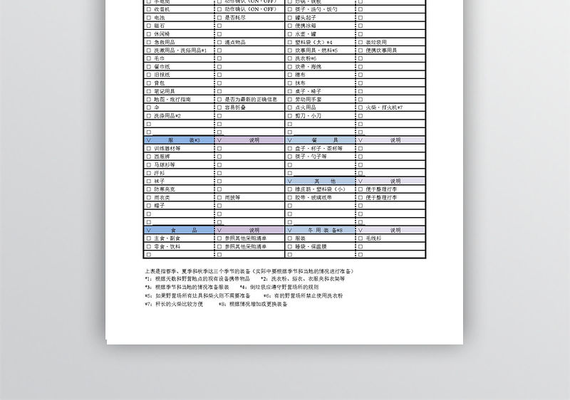 野營用品清單excel模板,高清圖片設計素材,1920x1080:0DPI,旅行,出行計劃,安排,藍色簡約表格,旅行,出行計劃,安排,藍色簡約表格 Array