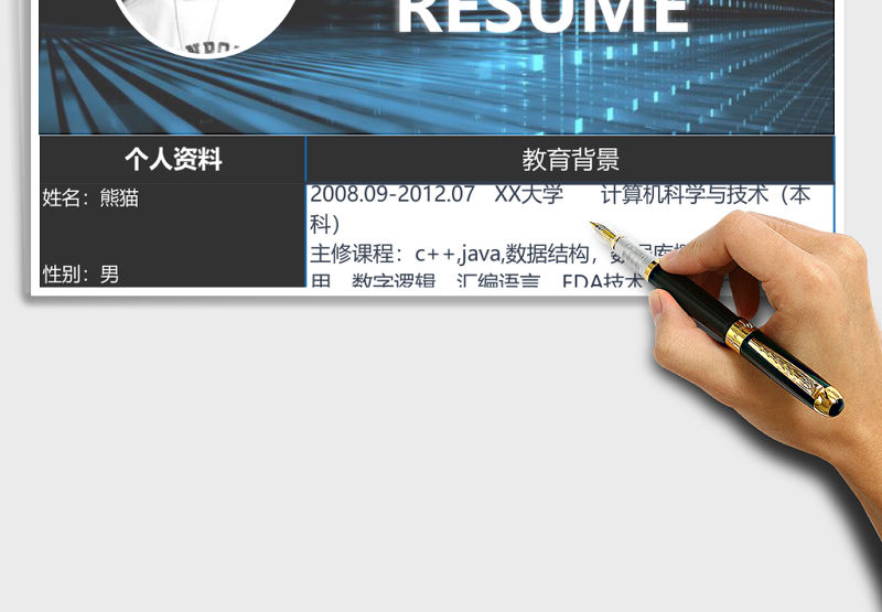 藍色高檔平面設計師Excel簡歷表格模版包含