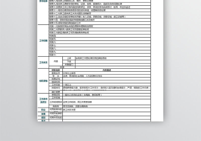 崗位說(shuō)明書(shū)(員工關(guān)系),高清圖片設(shè)計(jì)素材,1920x1080:0DPI,公司專用,EXCEL表格,小清新風(fēng)格,簡(jiǎn)單背景,內(nèi)容為可修改編輯,簡(jiǎn)潔風(fēng)格,A4打印文檔,表格文件 Array