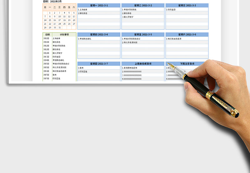 2021年日歷日程工作計劃表-一周計劃分類包含