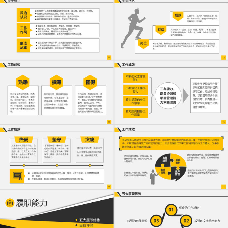 <p>崗位競聘報告競選崗位:行政部總監競聘人:代用名 2018.1</p><br><p>目錄CONTENTS崗位經歷干了些什么事情工作成效干得怎么樣履職能力有何能力履行職責工作規劃下一步怎么做</p><br><p>崗位經歷個人簡歷重要項目經歷崗位經歷</p><br><p>4個人簡歷學歷:北京大學本科學歷專業:行政管理籍貫:上海出生年月:1980年9月政治面貌:中共黨員所持有證書:列舉證書名稱自我評價:在公司工作近十年了,我認真工作,積累了一定的工作經驗的同時也對公司的營運非常了解。在領導和同事的關心幫助下出色地完成公司下達的各項工作。我擅長行政管理工作,項目管理,文案編制等。代用名現任職位:培訓主管</p><br><p>5崗位經歷2009年10月2010年10月崗位名稱輸入你工作的公司名稱列舉工作的主要內容及成績列舉工作的主要內容及成績列舉工作的主要內容及成績2010年11月2013年10月崗位名稱輸入你工作的公司名稱列舉工作的主要內容及成績列舉工作的主要內容及成績列舉工作的主要內容及成績</p><br><p>62013年11月2014年5月崗位名稱輸入你工作的公司名稱列舉工作的主要內容及成績列舉工作的主要內容及成績2014年6月2015年7月崗位名稱輸入你工作的公司名稱列舉工作的主要內容及成績列舉工作的主要內容及成績2015年8月2018年1月崗位名稱輸入你工作的公司名稱列舉工作的主要內容及成績列舉工作的主要內容及成績</p><br><p>7崗位經歷5年2年3年財務管理關于資產的購置(投資),資本的融通(籌資)和經營中現金流量(營運資金),以及利潤分配的管理。培訓專員負責管理員工培訓檔案,協助擬定培訓與發展計劃,聯系各類培訓機構,組織各類培訓并編寫評估報告。熟悉內部及外部培訓組織作業流程,熟悉培訓管理流程。行政管理既確定管理內容的目標和決定如何達到這些目標。采取具體措施,調動和協調各級行政管理人員按要求完成各項工作。</p><br><p>8重要項目經歷參與的重大項目010203040506輸入你參與的項目名稱配合集團經營公司、融資管理中心等相關部門,做好大量的會計報表資料、銀行資料、稅務資料工作。輸入你參與的項目名稱配合集團經營公司、融資管理中心等相關部門,做好大量的會計報表資料、銀行資料、稅務資料工作。輸入你參與的項目名稱配合集團經營公司、融資管理中心等相關部門,做好大量的會計報表資料、銀行資料、稅務資料工作。輸入你參與的項目名稱配合集團經營公司、融資管理中心等相關部門,做好大量的會計報表資料、銀行資料、稅務資料工作。輸入你參與的項目名稱配合集團經營公司、融資管理中心等相關部門,做好大量的會計報表資料、銀行資料、稅務資料工作。輸入你參與的項目名稱配合集團經營公司、融資管理中心等相關部門,做好大量的會計報表資料、銀行資料、稅務資料工作。</p><br><p>工作成就獎項榮譽工作成效思想成長情況</p><br><p>10獲得的獎項榮譽2008.10輸入你獲得的年度獎項名稱2009.5輸入你獲得的年度獎項名稱2010.1輸入你獲得的年度獎項名稱2012.10輸入你獲得的年度獎項名稱2017.11輸入你獲得的年度獎項名稱</p><br><p>11思想成長持續學習 不斷進步 參加工作十年時間里,無論在哪個工作崗位,我始終堅持持續學習,不斷充實自己。我認真貫徹黨的方針政策和公司的各項要求,始終保持政治學習及工作技能的培訓,在學習中領悟,在實踐中提升。確保自身思想與行動和公司保持一致。</p><br><p>12思想成長政治認識工作作風廉潔從業始終把個人思想道德建設放在突出位置,顧大局,識大體,講黨性。注重從講政治的觀點發現、分析、解決問題。自覺服從組織領導,維護集體權益,遵守組織紀律。能正確理解和掌握公司要求,并能及時貫徹執行。踏實工作,做到知實情、講實話、辦實事、求實效。能與部門人員、中隊班子真誠相待,密切協作。充分發揚民主,精誠團結與大家一道工作。能虛心聽取各方意見,敢于自己開展批評與自我批評。堅決做到既干事又干凈,沒有違反黨紀政紀條規的事。認真做好職責內的廉潔工作、不摸紅線、不觸底線。積極編制廉潔課件,組織中隊員工開展廉潔教育培訓。</p><br><p>13思想成長崗位無論在文秘,秘書崗位,還是在市場經營崗位和項目管理崗位,我都能自覺主動學習新知識,堅持理論學習與工作實踐相結合,切實在學以致用上下功夫。努力做到了“適應、主動、創造、規范”,豐富并提高了管理和服務能力,自身辦文、辦事、辦會能力和寫作能力不斷增強。行動成效入職十年,多次獲“優秀員工獎”稱號;思想認識和工作能力得到領導與同事們的一致認可。</p><br><p>14工作成效熟悉經過多個崗位的歷練,熟悉市場開拓、市場結算、招投標、合同談判簽訂、各類方案編制、標書制作、市場分析、價格測算、經營報表編制等一系列市場經營活動流程。撰寫在不同崗位上累計編寫各類方案60篇,標書上百份,總結40余篇,經營報表24期,全同200多份,實現了對市場經營方面的初步掌握。在市場部、基層分公司、項目部參與處理了多個突發事件、鍛煉了處理復雜問題的能力,懂得從公司、甲方、承包商等不同的角度來理解和處理一些問題,具備了單獨駕馭處理復雜局面的能力。懂得</p><br><p>15工作成效不斷強化工作責任心不斷強化工作執行力著力提高自身工作水平著力提高自身工作質量三辦能力、綜合協調和項目管理能力不