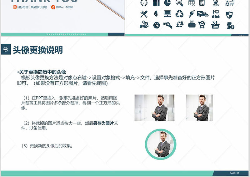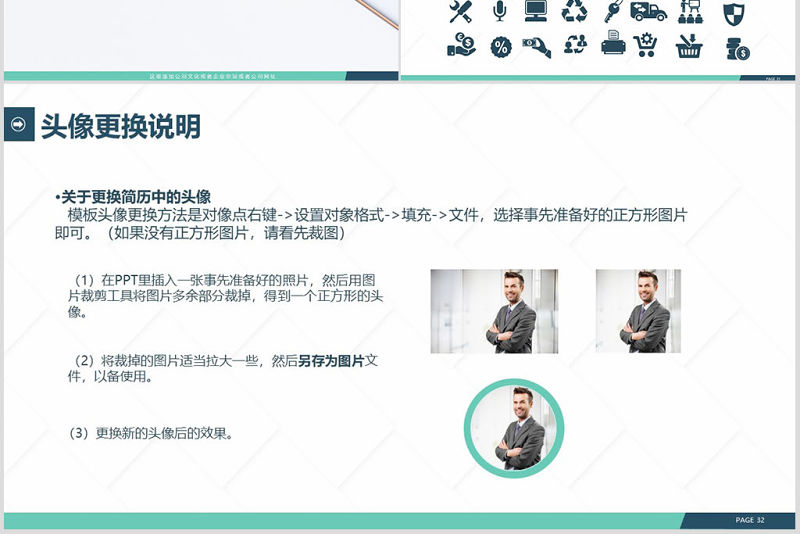 頭像更換說明關于更換簡歷中的頭像 模板頭像更換方法是對像點右鍵->設置對象格式->填充->文件,選擇事先準備好的正方形圖片即可。(如果沒有正方形圖片,請看先裁圖)(1)在PPT里插入一張事先準備好的照片,然后用圖片裁剪工具將圖片多余部分裁掉,得到一個正方形的頭像。(2)將裁掉的圖片適當拉大一些,然后另存為圖片文件,以備使用。(3)更換新的頭像后的效果。
