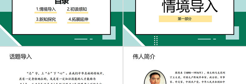 偉人簡介 周恩來(1898-1976年),偉大的馬克思列寧主義者,中國無產階級革命家、政治家、軍事家、外交家,中國共產黨、中華人民共和國和中國人民解放軍的主要締造者和領導人之一,畢業于南開大學,早年留學日本、法國等地,自1949年起任中華人民共和國國務院總理,1976年逝世。