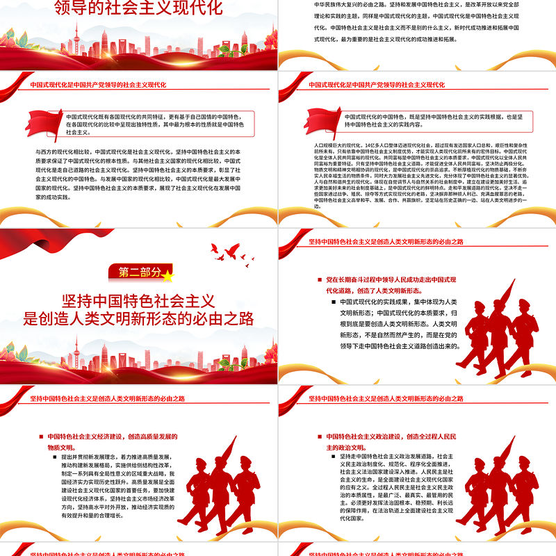 堅持中國特色社會主義是創造人類文明新形態的必由之路黨在長期奮斗過程中領導人民成功走出中國式現代化道路,創造了人類文明新形態。 中國式現代化的實踐成果,集中體現為人類文明新形態;中國式現代化的本質要求,歸根到底是要創造人類文明新形態。人類文明新形態,不是自然而然產生的,而是在黨的領導下走中國特色社會主義道路創造出來的。