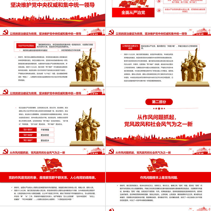 黨的政治建設是黨的根本性建設決定黨的建設方向和效果新時代,我們黨從戰略和全局高度出發,把黨的政治建設納入黨的建設總體布局并擺在首位。保證全黨服從中央、堅持黨中央權威和集中統一領導,是黨的政治建設的首要任務,也是新時代全面從嚴治黨取得的歷史性、開創性成就。黨的十八大以來,我們黨把“兩個維護”作為最高政治原則和根本政治規矩,制定和頒布《關于新形勢下黨內政治生活的若干準則》,嚴明政治紀律和政治規矩,堅決治理“七個有之”問題,堅決清除陽奉陰違的“兩面人”,以精準有力的政治監督確保黨中央大政方針和決策部署貫徹落實。以黨的政治建設為統領,堅決維護黨中央權威和集中統一領導