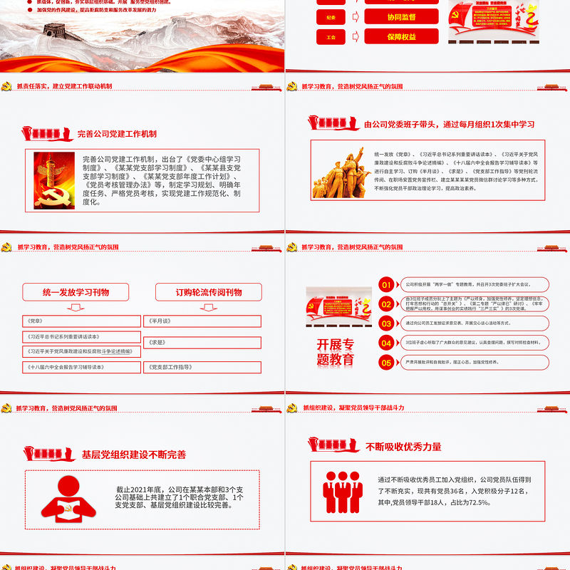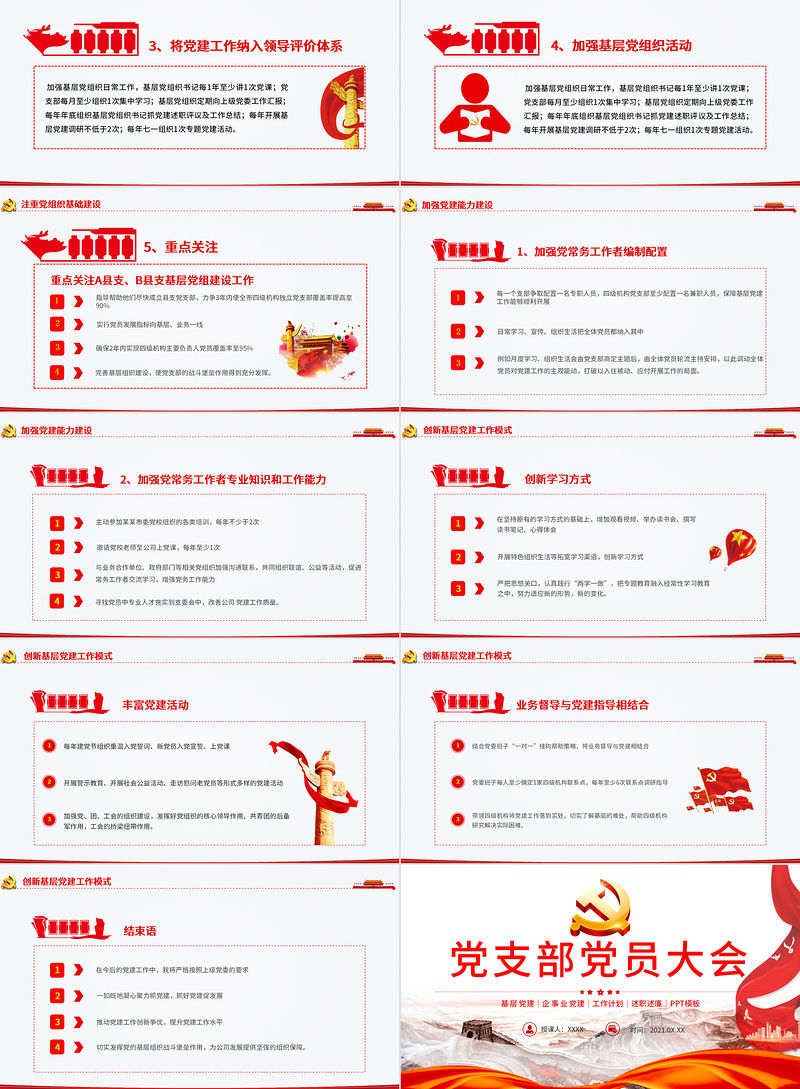 2021黨支部黨員大會PPT紅色大氣基層黨組織黨務工作總結問題分析及工作計劃黨課模板