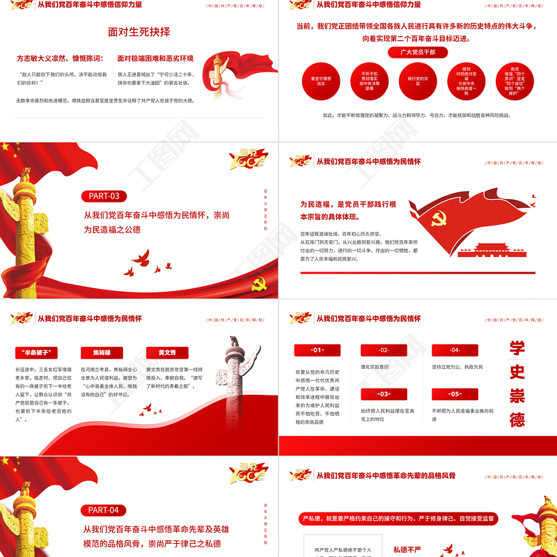 /中/國/共/產/黨/百/年/輝/煌/學習黨的歷史要自覺從黨的光輝歷史中尋找道德坐標,用共產黨人的崇高道德滋養初心、引領使命,賡續精神血脈。明鏡照形,知史鑒今當前,中華民族偉大復興正處于關鍵時期我們要立足百年大黨新起點,把崇高道德、革命精神、優良傳統、紅色基因轉化為奮進新時代的強大精神力量,努力在新征程創造新的更大業績。