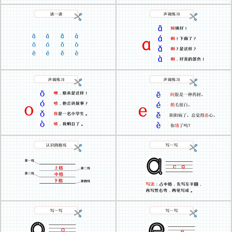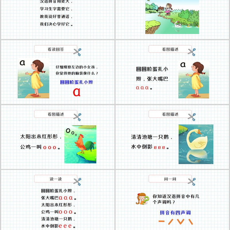 <p>漢語拼音:a o e老師:辦圖網人教版一年級語文</p><br><p>讀兒歌漢語拼音用處大,學習生字需要它,教我說好普通話,我們決心學好它。 </p><br><p>看一看</p><br><p>看讀回答圓圓臉蛋扎小辮ɑ仔細觀察左邊的小女孩,你覺得她的腦袋像什么?</p><br><p>看圖描述圓圓臉蛋扎小辮,張大嘴巴ɑ ɑ ɑ。</p><br><p>看圖描述太陽出來紅彤彤,公雞一叫 o o o。</p><br><p>看圖描述清清池塘一只鵝,水中倒影 e e e。</p><br><p>讀一讀圓圓臉蛋扎小辮,張大嘴巴ɑ ɑ ɑ。太陽出來紅彤彤,公雞一叫o o o。清清池塘一只鵝,水中倒影e e e。</p><br><p>問一問拼音有四聲調</p><br><p>讀一讀āōēá ó éǎǒěàòè</p><br><p>聲調練習阿姨好!āɑ啊!下雨了?á啊?是這樣?ǎ啊,好美的景色!à</p><br><p>聲調練習噢,原來是這樣!ōo哦,他會講故事?ó我是一名小學生。ǒ哦,我明白了。ò</p><br><p>聲調練習阿膠是一種藥材。ēe鵝毛很白。é陽陽病了,總覺得惡心。ě你餓了嗎?è</p><br><p>認識四格線上格中格下格</p><br><p>寫一寫cɑ寫法:占中格,先寫左半圓,再寫豎右彎,兩筆寫成。</p><br><p>寫一寫o寫法:占中格,從左上起筆,一筆寫成。</p><br><p>寫一寫寫法:占中格,先從里面橫起筆,一筆寫成。e</p><br><p>練一練ɑɑɑɑ</p><br><p>練一練oooo</p><br><p>練一練eeee</p><br><p>課后練習1、練習書寫a、o、e2、把課本中的圖片用所學的內容講給爸爸媽媽聽。</p><br><p>感謝您下載辦圖網平臺上提供的PPT作品,為了您和辦圖網以及原創作者的利益,請勿復制、傳播、銷售,否則將承擔法律責任!辦圖網將對作品進行維權,按照傳播下載次數進行十倍的索取賠償!1.在辦圖網出售的PPT模板是免版稅類(RF:Royalty-Free)正版受《中華人民共和國著作權法》和《世界版權公約》的保護,作品的所有權、版權和著作權歸辦圖網所有,您下載的是PPT模板素材的使用權。2.不得將辦圖網的PPT模板、PPT素材,本身用于再出售,或者出租、出借、轉讓、分銷、發布或者作為禮物供他人使用,不得轉授權、出賣、轉讓本協議或者本協議中的權利。更多精品PPT模板:www.888ppt.com版權聲明</p><br><p>感謝觀看下課啦</p><br>