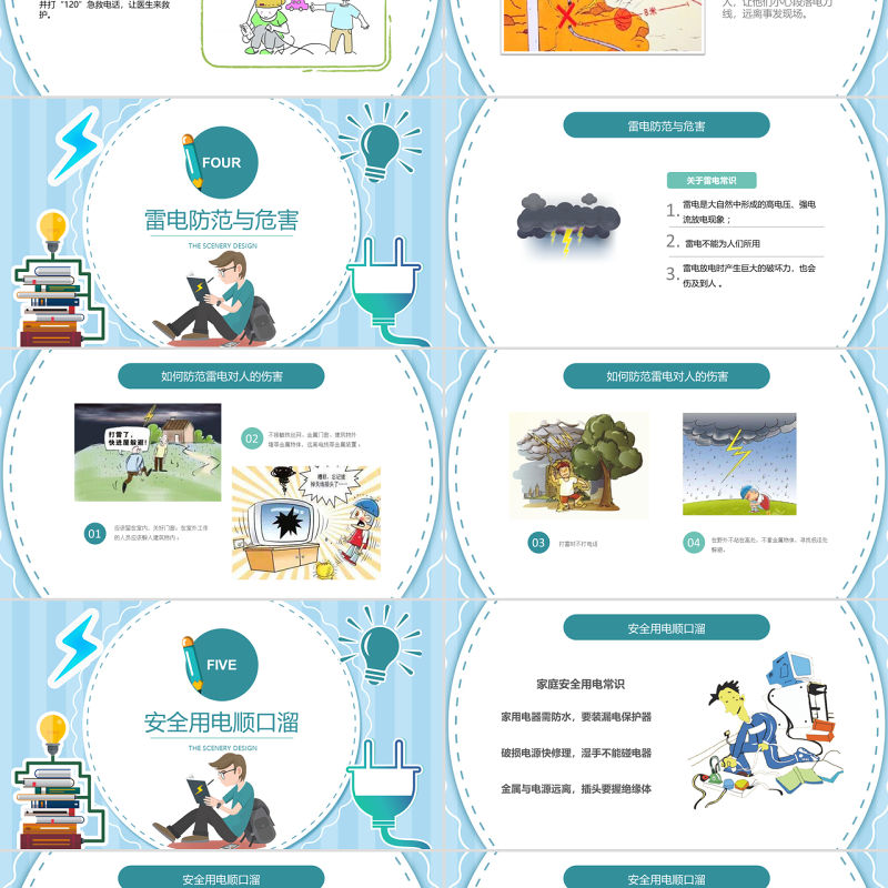 <p></p><br><p>目錄DIRECTORY1電的簡單認識2電的危害3生活中安全用電4雷電防范與危害5安全用電順口溜</p><br><p>ONE</p><br><p>1、雷電現象雷電是伴有閃電和雷鳴的一種雄偉壯觀而又有點令人生畏的放電現象。產生雷電的條件是雷雨云中有積累并形成極性。根據不同的地形及氣象條件,雷電一般可分為熱雷電、鋒雷電(熱鋒雷電與冷鋒雷電)、地形雷電3大類。2、靜電現象靜電是一種處于靜止狀態的電荷。在干燥和多風的秋天,在日常生活中,人們常常會碰到這種現象.</p><br><p></p><br><p>TWO</p><br><p>電的危害主要分兩種: 一、電器火災二、人身觸電</p><br><p>電器老化停止使用電器附件不可堆放可燃物當聞到燒膠皮、燒塑料的難聞氣味時,應立即停電并檢查電器是否故障 。電器接線要牢固,插頭不能松動 </p><br><p>1首先切斷著火點電源; 2求助大人滅火(通常情況下,用干燥的沙子或專用的干粉滅火器滅火,千萬不能用水滅火,也不能用泡沫滅火器滅火,因為水導電,容易觸電傷人); 3較大火災要迅速逃離火場并撥打“119火警電話(一定要告訴消防人員準確的地址) 。</p><br><p></p><br><p>THREE</p><br><p></p><br><p> 家中發現有破損的插排一定不要繼續使用,可以告訴父母更換新的,繼續使用非常危險,很容易短路引起火災,甚至造成生命危險。</p><br><p> 濕手、濕布有導電作用。不要用濕手、濕布觸摸、擦拭電器外殼。正常情況下,家用電器的外殼不帶電。如果連接它的導線破損或受潮漏電,外殼就會帶電,就可能發生觸電事故。 不要用手、金屬物或鉛筆芯等東西去撥弄開關,也不要把它們插到插座孔里。不要亂動電線、燈頭、插座。因為,帶電部分也許已暴露在外,接觸它有觸電的危險。 </p><br><p> 在戶外玩耍時,要遠離高壓輸電設備及配電室之類的地方。不要在高壓線附近放風箏,不要到配電室中去玩耍。哪怕安裝燈泡等簡單的事情,也要先關斷電源,并在家長的指導下進行。 </p><br><p> 戶外活動遇到雷雨時,不要站在大樹、煙囪、尖塔、電線桿等底下,也不要站在山頂上,因為高聳、凸出的物體容易遭受雷擊。在開闊的水面游泳或劃船的同學,在雷雨時要趕快離開水面,否則會成為雷擊的目標。 電閃雷鳴風雨急,藏到樹下去躲雨其實這里不安全,這樣最易遭雷擊</p><br><p> 家用電器冒煙,起火怎么辦?使用家用電器時,一旦發現冒煙、起火,應當馬上拔下電源線插頭,切斷電源。一般說來,家用電器冒煙、起火是由于電器內部產生障礙造成的,所以,必須首先切斷電源。 發生電器火災時候 先斷開電源后滅火</p><br><p>發現有人觸電,在救助時,首先要切斷電源。在切斷電源之前,千萬不要用手去拉觸電者,否則救助者也會觸電。小學生因為人小,無法對觸電實施救護,應該及早地叫大人來處理,并打“120”急救電話,讓醫生來救護。 </p><br><p>發現段落電力線,不要靠近,即使自己的玩具再好,也不能過去撿起,應當立即找電工處理,如果有時間可以再附近告知經過的人,讓他們小心段落電力線,遠離事發現場。</p><br><p>FOUR</p><br><p>1.雷電是大自然中形成的高電壓、強電流放電現象 ;2. 雷電不能為人們所用 3.雷電放電時產生巨大的破壞力,也會傷及到人 。關于雷電常識</p><br><p>應該留在室內,關好門窗;在室外工作的人員應該躲入建筑物內 ;01不接觸鐵絲網、金屬門窗、建筑物外墻等金屬物體,遠離電線等金屬裝置 ;02</p><br><p>打雷時不打電話 03在野外不站在高處,不拿金屬物體,尋找低洼處躲避。 04</p><br><p>FIVE</p><br><p>家庭安全用電常識 家用電器需防水,要裝漏電保護器破損電源快修理,濕手不能碰電器金屬與電源遠離,插頭要握絕緣體</p><br><p>室外安全注意事項躲開變壓器,安全不觸電釣魚放風箏,遠離高壓線 </p><br><p>室外安全注意事項大雨來臨時,放雷避危險 尋找低洼處,不往高處站</p><br><p> 同學們!通過今天的學習,大家對電的知識有了一個簡單抽象的了解,大家也學習了一些生活中的用電常識和注意事項、學習了一些常見的電力安全標志,希望同學們在今后的生活中注意用電安全,更好的保護自己,也希望大家努力學習,將來更好的研究電,讓它為我們的生產生活帶來更大的益處! 安全用電小結</p><br><p></p><br>