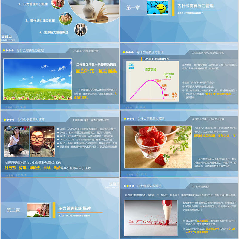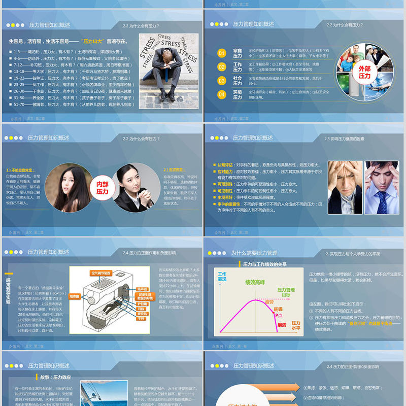 2.2 為什么會有壓力?生容易,活容易,生活不容易——“壓力山大”普遍存在。1-3——喝奶粉,壓力大,有木有?(土奶粉有毒,洋奶粉太貴)4-6——防意外,壓力大,有木有?(既怕無辜被砍,又怕老師虐待)7-12——補習班,壓力大,有木有?(周六奧數英語,周日琴棋書畫)13-18——考大學,壓力大,有木有?(千軍萬馬獨木橋,狹路相逢)19-22——各種證,壓力大,有木有?(考研考證考公仆,為了就業)23-25——找工作,壓力大,有木有?(必須名牌畢業,至少兩年經驗)26-30——干事業,壓力大,有木有?(加班沒日沒夜,健康越來越差)31-50——養全家,壓力大,有木有?(孩子妻子老子,房子車子票子)51-70——被啃老,壓力大,有木有?(從前養兒防老,現在養兒到老)