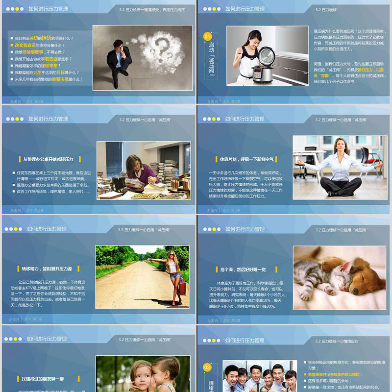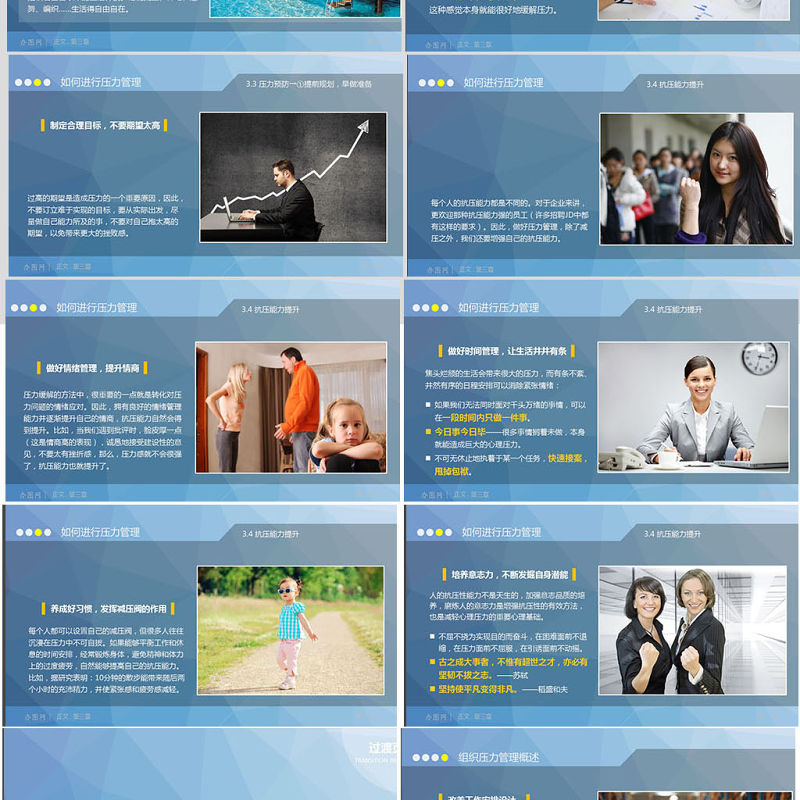 3.4 抗壓能力提升養成好習慣,發揮減壓閥的作用每個人都可以設置自己的減壓閥,但很多人往往沉浸在壓力中不可自拔。如果能夠平衡工作和休息的時間安排,經常鍛煉身體,避免精神和體力上的過度疲勞,自然能夠提高自己的抗壓能力。比如,據研究表明:10分鐘的散步能帶來隨后兩個小時的充沛精力,并使緊張感和疲勞感減輕。