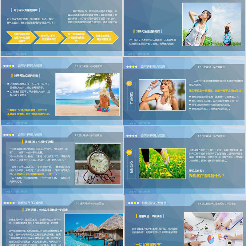 3.2 壓力緩解→③問題應對對于無法控制的事情只要是自己不能控制的事情,就由它去,不要過多的考慮,給自己增添無謂的壓力。人的煩惱就是來自于:忘了自己的事,愛管別人的事,擔心老天爺的事。打理好自己的事,不去管別人的事,別操心老天爺的事。