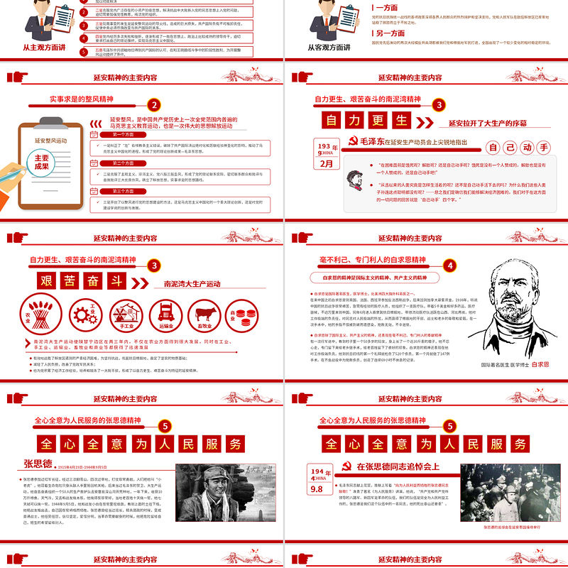 延安精神的主要內容全心全意為人民服務的張思德精神張思德1915年4月19日-1944年9月5日張思德參加過紅軍長征,經過三次翻雪山、四次過草地,打仗非常勇敢,人們把他叫“小老虎”,他冒著生命危險只身從敵人手里搶回機關槍。后來當過毛澤東的警衛。大生產運動,他自告奮勇組織一個50人的生產救護隊去安塞縣深山溝開荒種地,一年下來,收獲10萬斤糧食。天氣冷,又去和戰友燒木炭。他燒得炭非常好,當地老百姓十天燒一窯,他七天就可以燒一窯。1944年9月5日,他和戰友小白在炭窯里挖煙囪,看到上面的土往下塌,他把戰友推出去,自己因炭窯坍塌而犧牲。張思德曾經當過班長,精兵簡政的時候,變成普通戰士,他任勞任怨,信仰堅定,愛憎分明,當革命需要獻身的時候,他把危險留給自己,把生的希望留給別人。