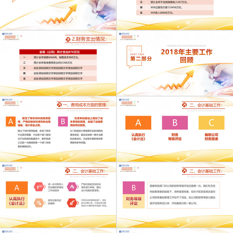 二、會計基礎工作:2018? 2019NIAN DU CAI WU CHU NA NIAN ZHONG GONG ZUO ZONG JIE A進一步對財務人員加強財務基礎工作的指導規范記賬憑證的編制嚴格對原始憑證的合理性進行審核,強化會計檔案的管理等。對所有成本費用按部門、項目進行歸集分類,月底將共同費用進行分攤結轉體現部門效益。認真執行《會計法》