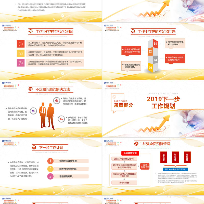 不足和問題的解決方法2018? 2019NIAN DU CAI WU CHU NA NIAN ZHONG GONG ZUO ZONG JIE 財務人員設定學習目標,通過考試取得職稱和學歷,并與績效掛鉤,逐步提高自我;參與管理,參與公司的重大經營決策,來充分發揮財務部的管理職能;首先確定制度和規定的適用性和可執行性,如有障礙,向執行部門提出,然后堅決執行到底;
