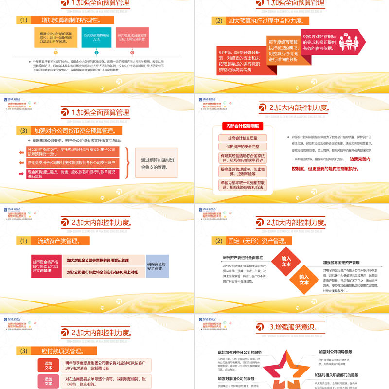 1.加強全面預算管理 2018? 2019NIAN DU CAI WU CHU NA NIAN ZHONG GONG ZUO ZONG JIE 根據集團公司要求,明年分公司資金將實行收支兩條線;(3)加強對分公司貨幣資金預算管理。分公司的貨款支付、受托辦理等各項投資支出由子公司按照預算統一支付費用類支出子公司按月按預算劃撥到各分公司支出賬戶現金流將通過進貨、銷售、應收帳款和銀行對帳單情況進行監督通過預算加強對資金收支的管理。