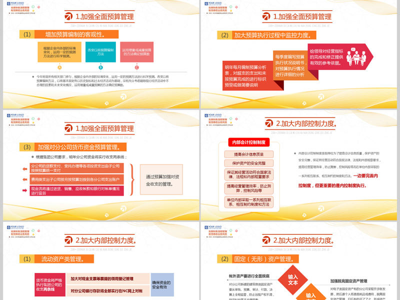 1.加強全面預算管理 2018? 2019NIAN DU CAI WU CHU NA NIAN ZHONG GONG ZUO ZONG JIE 全面預算管理企業在戰略目標的指導下對經營活動和相應財務結果進行預測和籌劃監控執行過程將實際完成情況與預算目標對照和分析改善和調整經營預算財務預算專項預算量化安排來指導經營活動全面預算管理是指企業在戰略目標的指導下,對未來的經營活動和相應財務結果進行充分、全面的預測和籌劃,并通過對執行過程的監控,將實際完成情況與預算目標不斷對照和分析,從而及時指導經營活動的改善和調整,以幫助管理者更加有效地管理企業和最大程度地實現戰略目標。通過經營預算、財務預算和專項預算實行動態規劃,量化安排來指導經營活動,從而真正實現事前、事中和事后的全過程控制。