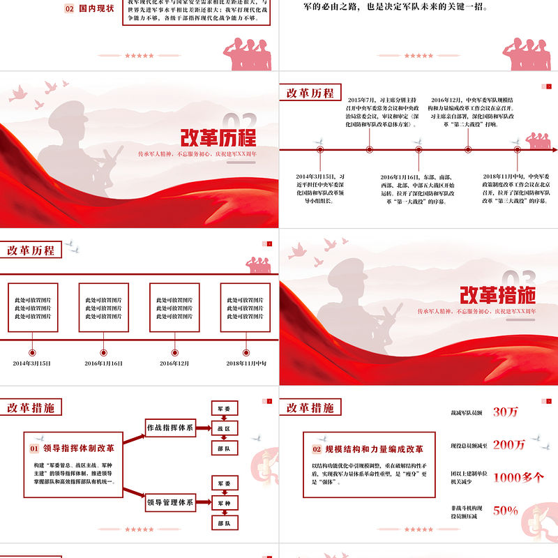 <p>59書寫改革強(qiáng)軍時代答卷新時代國防和軍隊(duì)建設(shè)成就綜述匯報(bào)人:工圖網(wǎng)時間:2022.08.10</p><br><p>目錄CONTENTS</p><br><p></p><br><p>改革背景我軍現(xiàn)代化水平與國家安全需求相比差距還很大,與世界先進(jìn)軍事水平相比差距還很大;我軍打現(xiàn)代化戰(zhàn)爭能力不夠,各級干部指揮現(xiàn)代化戰(zhàn)爭能力不夠。我軍現(xiàn)代化水平與國家安全需求相比差距還很大,與世界先進(jìn)軍事水平相比差距還很大;我軍打現(xiàn)代化戰(zhàn)爭能力不夠,各級干部指揮現(xiàn)代化戰(zhàn)爭能力不夠。</p><br><p>改革背景習(xí)主席深刻指出:我們必須以更大的智慧和勇氣深化國防和軍隊(duì)改革。這是實(shí)現(xiàn)中國夢、強(qiáng)軍夢的時代要求,是強(qiáng)軍興軍的必由之路,也是決定軍隊(duì)未來的關(guān)鍵一招。</p><br><p></p><br><p>改革歷程2014年3月15日,習(xí)近平擔(dān)任中央軍委深化國防和軍隊(duì)改革領(lǐng)導(dǎo)小組組長。2018年11月中旬,中央軍委政策制度改革工作會議在北京召開,拉開了深化國防和軍隊(duì)改革“第三大戰(zhàn)役”的序幕。2015年7月,習(xí)主席分別主持召開中央軍委常務(wù)會議和中央政治局常委會議,審議和審定《深化國防和軍隊(duì)改革總體方案》。2016年1月16日,東部、南部、西部、北部、中部五大戰(zhàn)區(qū)開始運(yùn)轉(zhuǎn)。拉開了深化國防和軍隊(duì)改革“第一大戰(zhàn)役”的序幕。2016年12月,中央軍委軍隊(duì)規(guī)模結(jié)構(gòu)和力量編成改革工作會議在京召開。習(xí)主席親自部署,深化國防和軍隊(duì)改革“第二大戰(zhàn)役”打響。</p><br><p>改革歷程2014年3月15日2018年11月中旬此處可放置圖片此處可放置圖片此處可放置圖片2016年1月16日2016年12月此處可放置圖片此處可放置圖片此處可放置圖片此處可放置圖片此處可放置圖片此處可放置圖片此處可放置圖片此處可放置圖片此處可放置圖片</p><br><p></p><br><p>改革措施</p><br><p>改革措施以結(jié)構(gòu)功能優(yōu)化牽引規(guī)模調(diào)整,重在破解結(jié)構(gòu)性矛盾,實(shí)現(xiàn)我軍力量體系革命性重塑,是“瘦身”更是“強(qiáng)體”。30萬200萬1000多個50%非戰(zhàn)斗機(jī)構(gòu)現(xiàn)役員額壓減裁減軍隊(duì)員額現(xiàn)役總員額減至團(tuán)以上建制單位機(jī)關(guān)減少</p><br><p>改革措施出臺27項(xiàng)體現(xiàn)軍事職業(yè)特點(diǎn)政策制度,為提高部隊(duì)?wèi)?zhàn)斗力、激發(fā)部隊(duì)活力提供了堅(jiān)實(shí)的制度保證。</p><br><p></p><br><p>改革成就新的軍委機(jī)關(guān)建設(shè)、管理、監(jiān)督路徑更加清晰,規(guī)劃、執(zhí)行、評估職能配置更加合理,更加聚焦戰(zhàn)略謀劃和宏觀管理。聯(lián)合作戰(zhàn)指揮的重心放在戰(zhàn)區(qū),部隊(duì)建設(shè)管理的重心放在軍兵種,戰(zhàn)區(qū)專司打仗、主營聯(lián)合,軍種以戰(zhàn)領(lǐng)建、抓建為戰(zhàn)。部隊(duì)實(shí)行軍—旅—營體制,兵種作戰(zhàn)力量得到加強(qiáng),指揮層級減少,作戰(zhàn)指揮更加扁平、順暢,戰(zhàn)斗編組更加合成、靈活。</p><br><p>改革成就規(guī)模結(jié)構(gòu)不斷優(yōu)化新調(diào)整組建諸多新型作戰(zhàn)力量,軍兵種比例、官兵比例大幅改善。各級機(jī)關(guān)編制壓減,各級機(jī)關(guān)內(nèi)設(shè)機(jī)構(gòu)、領(lǐng)導(dǎo)層級和人員減少。精銳作戰(zhàn)力量得到加強(qiáng),有力推動人民軍隊(duì)向質(zhì)量效能型轉(zhuǎn)變。</p><br><p>改革成就軍委著力解決戰(zhàn)區(qū)建設(shè)理論、法規(guī)等現(xiàn)實(shí)問題,搭建戰(zhàn)區(qū)聯(lián)合作戰(zhàn)指揮體系架構(gòu)。戰(zhàn)區(qū)發(fā)揮樞紐作用,用現(xiàn)實(shí)任務(wù)牽引聯(lián)合訓(xùn)練,用作戰(zhàn)方案主導(dǎo)聯(lián)合訓(xùn)練,用檢驗(yàn)評估撬動聯(lián)合訓(xùn)練。兵種部隊(duì)對接聯(lián)合作戰(zhàn)能力需求,創(chuàng)新組織系列軍兵種戰(zhàn)役訓(xùn)練,不斷提升勝戰(zhàn)貢獻(xiàn)率。</p><br><p>改革成就建立軍官職業(yè)化制度優(yōu)化軍人待遇保障完善軍事訓(xùn)練、裝備發(fā)展、后勤建設(shè)、軍事科研、國防動員等方面政策制度。中國特色軍事法規(guī)制度體系不斷完善,讓一切有利于戰(zhàn)斗力建設(shè)的要素競相迸發(fā)活力,最大限度吸引和集聚優(yōu)秀人才,有效激發(fā)了官兵投身改革強(qiáng)軍的積極性、主動性、創(chuàng)造性。</p><br><p>59書寫改革強(qiáng)軍時代答卷新時代國防和軍隊(duì)建設(shè)成就綜述匯報(bào)人:工圖網(wǎng)時間:2022.08.10</p><br>