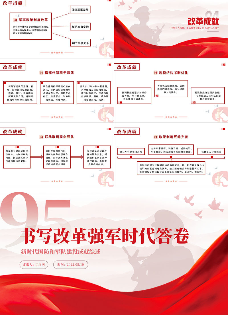 工圖網(wǎng)提供書寫改革強(qiáng)軍時代答卷PPT簡約黨建風(fēng)新時代國防和軍隊(duì)建設(shè)成就綜述專題黨課課件模板供會員免費(fèi)下載。更多精彩黨課PPT素材,盡在工圖網(wǎng)。