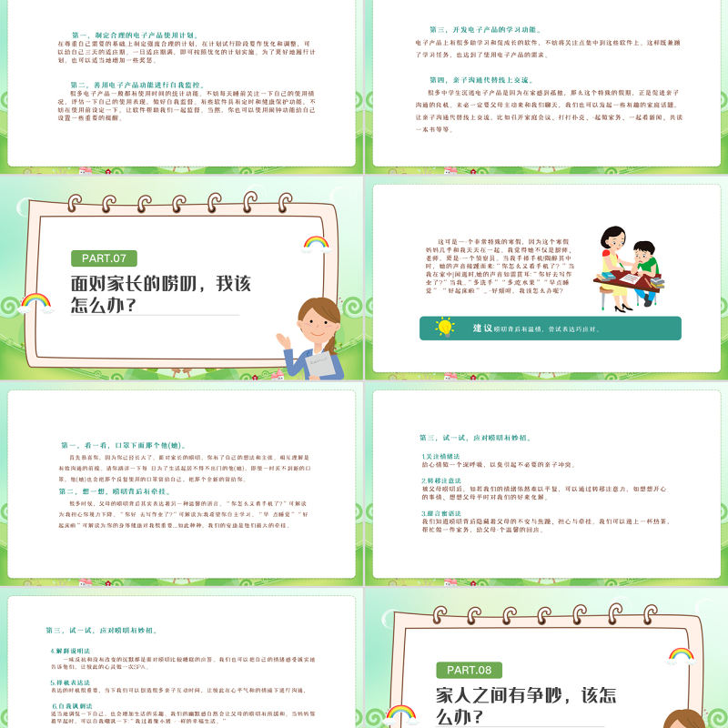 ,4.解釋說明法, 一味反抗和沒有改變的沉默都是面對嘮叨比較糟糕的應答。我們也可以把自己的情緒感受誠實地告訴他們,讓彼此的心靈做一次SPA。,,5.擇機表達法,表達的時機很重要,當下我們可以創造很多親子互動時間,讓彼此在心平氣和的情境下進行溝通, ,, 6.自我諷刺法,適當地調侃一下自己,也會增加生活的樂趣。我們的幽默感自然會讓父母的嘮叨有所緩和。當媽媽催著早起時,可以自我嘲諷一下:“我過著像小豬 - -樣的幸福生活。”,,7.積極賦能法, 將父母的嘮叨轉化成自己學習、生活的動力,讓父母的嘮叨促使自己向更好的方向發展,而不要將其作為行動的阻礙。 第三,試一試,應對嘮叨有妙招。