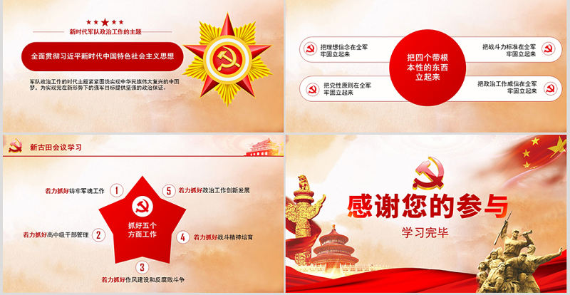 革命的政治工作是革命的生命線。 堅持黨對軍隊的絕對領導是強軍之魂,鑄牢軍魂是我軍政治工作的核心任務,任何時候都不能動搖。 2014年10月30日全軍政治工作會議在古田召開,會議的主體精神是:一個軍隊政治工作的時代主題; 把四個帶根本性的東西立起來 ;抓好五個方面工作 。新古田會議學習一個主題四個立起來五個抓好