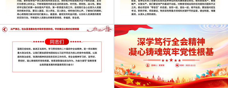 宣講人:某某某 時間:2025.12.13 深學篤行全會精神 凝心鑄魂筑牢黨性根基 黨的二十屆四中全會,是在中華人民共和國成立76周年之際,也是在實現“十四五”規劃目標任務 的關鍵節點上,召開的一次具有全局性、歷史性意義的重要會議。全會擘畫了未來五年乃至更長時 期國家發展的宏偉藍圖,為我們推進中國式現代化指明了前進方向、提供了根本遵循。作為教育戰 線的黨員干部,我們必須帶頭學習好、宣傳好、貫徹好全會精神,自覺將其轉化為推動教育改革發 展的強大動力和生動實踐。今天,我們在這里召開全局干部職工大會,并舉行一次專題黨課。主要 目的,是深入學習領會黨的二十屆四中全會精神,統一思想、凝聚共識、明確方向,動員全局上下 以更加飽滿的熱情和更加扎實的作風,奮力開創我縣教育事業高質量發展的新局面。下面,我圍繞 “深學篤行四中全會精神凝心鑄魂筑牢黨性根基”這個主題,與同志們交流三點體會。 /CONTENTS 深學細悟,在把握時代脈搏中堅定理想信念,筑牢對黨忠誠的政治根基 知行合一,在服務發展大局中強化擔當作為,夯實干事創業的能力根基 從嚴律己,在永葆清廉本色中筑牢思想防線,守好廉潔從教的紀律根基 深學細悟,在把握時代脈搏中堅定理想信 念,筑牢對黨忠誠的政治根基 [ 第一部分 ] 深學細悟,在把握時代脈搏中堅定理想信念,筑牢對黨忠誠的政治根基 理想信念是共產黨人精神上的“鈣”,沒有理想信念,或者理想信 念不堅定,精神上就會“缺鈣”,就會得“軟骨病”。學習貫徹四 中全會精神,首要任務就是通過深度學習,不斷加深對黨的創新理 論的理解和認同,從而堅定我們的理想信念,筑牢對黨忠誠的思想 根基。 深學細悟,在把握時代脈搏中堅定理想信念,筑牢對黨忠誠的政治根基 要深刻領悟全會精神的重大意義,在感受發展成就中堅定“四個自信”。 1 黨的二十屆四中全會系統總結了過去幾年我們黨團結帶領全國各族人民取得的 輝煌成就。這些成就的取得,根本在于有以習近平同志為核心的黨中央的堅強 領導,在于有習近平新時代中國特色社會主義思想的科學指引。全會強調,必 須堅持和加強黨的全面領導,這是推進中國式現代化的根本保證。通過學習全 會精神,回顧我們身邊的發展變化,我們必須更加深刻地認識到,只有堅持黨 的領導,我們的事業才能行穩致遠。我們要將這種認識內化為堅定的道路自信、 理論自信、制度自信和文化自信,始終做到感黨恩、聽黨話、跟黨走。 深學細悟,在把握時代脈搏中堅定理想信念,筑牢對黨忠誠的政治根基 要精準把握全會精神的核心要義,在“深學細悟”中提升政治素養。 2 四中全會內容博大精深,我們不能淺嘗輒止、浮于表面。全會明確提出要“一 體推進教育科技人才發展”,將教育擺在了前所未有的戰略高度。這充分體現 了黨中央對教育事業的高度重視和殷切期望。同時,全會強調要“辦好人民滿 意的教育”,堅持以人民為中心的發展思想,聚焦解決人民群眾在教育領域的 急難愁盼問題。此外,全會還就弘揚和踐行社會主義核心價值觀、堅持馬克思 主義在意識形態領域的指導地位等方面作出了重要部署。要通過黨委理論學習 中心組學習、黨支部“三會一課”、青年理論學習小組等多種形式,開展專題 研討和交流,真正做到學深悟透、融會貫通,不斷提高政治判斷力、政治領悟 力、政治執行力,確保我們的教育工作始終沿著黨指引的正確方向前進。 深學細悟,在把握時代脈搏中堅定理想信念,筑牢對黨忠誠的政治根基 要系統謀劃“十五五”發展藍圖,在科學布局中彰顯政治擔當。 3 “十五五”時期是銜接我國實現第一個百年奮斗目標和第二個百年奮斗目標的 關鍵五年。四中全會對制定“十五五”規劃提出了明確要求,強調要堅持目標 導向和問題導向相結合,科學謀劃未來五年的發展。對于我們*縣的教育事業而 言,科學編制和實施“十五五”教育發展規劃,是貫徹落實全會精神最重大政 治任務。我們要有前瞻性思維,將人口結構變化、城鎮化進程、產業轉型升級 等宏觀因素納入規劃視野。要堅持問題導向,聚焦當前我縣教育存在的短板和 弱項,比如城鄉教育資源不均衡、優質學位供給不足、教師隊伍結構性矛盾、 體教融合深度不夠等問題,拿出切實可行的解決方案。 知行合一,在服務發展大局中強化擔當作 為,夯實干事創業的能力根基 [ 第二部分 ] 知行合一,在服務發展大局中強化擔當作為,夯實干事創業的能力根基 學習的目的全在于運用。學習貫徹四中全會精神,關鍵在于知行合 一,將其轉化為指導實踐、推動工作的具體行動。我們教育系統的 每一位同志,都要自覺地把個人工作融入黨和國家事業大局,融入 縣經濟社會發展全局,以實際行動詮釋擔當與作為。 知行合一,在服務發展大局中強化擔當作為,夯實干事創業的能力根基 四中全會再次強調了為黨育人、為國育才的根本要求。教育的根本任務是立德樹 人。我們培養的人,必須是擁護中國共產黨領導和我國社會主義制度、立志為中 國特色社會主義事業奮斗終身的有用人才。這就要求我們必須將全會精神全面融 入辦學治校、教書育人的全過程。要持續深化思政課改革創新,善于運用學生喜 聞樂見的方式,將黨的創新理論、社會主義核心價值觀、中華優秀傳統文化講深、 講透、講活,引導廣