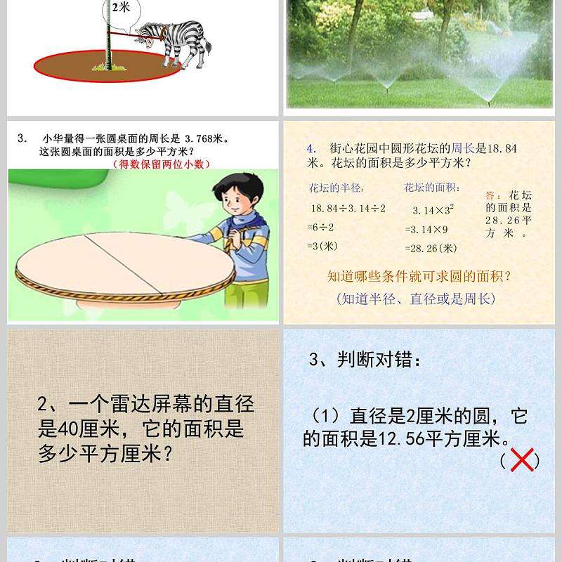3、判斷對錯:(1)直徑是2厘米的圓,它的面積是12.56平方厘米。 ( )×