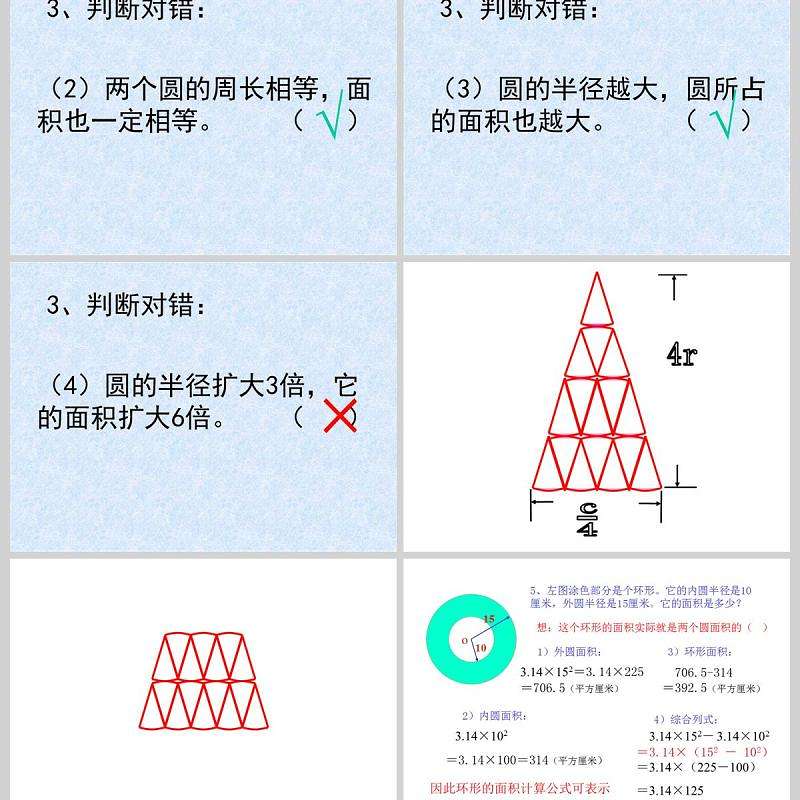 3、判斷對錯:(4)圓的半徑擴大3倍,它的面積擴大6倍。 ( )×