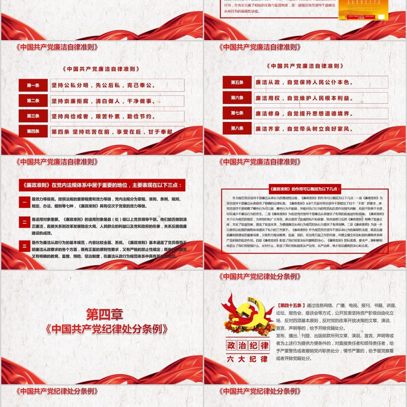 六 大 紀 律【第四十五條 】通過信息網絡、廣播、電視、報刊、書籍、講座、論壇、報告會、座談會等方式,公開發表堅持資產階級自由化立場、反對四項基本原則,反對黨的改革開放決策的文章、演說、宣言、聲明等的,給予開除黨籍處分。發布、播出、刊登、出版前款所列文章、演說、宣言、聲明等或者為上述行為提供方便條件的,對直接責任者和領導責任者,給予嚴重警告或者撤銷黨內職務處分;情節嚴重的,給予留黨察看或者開除黨籍處分。