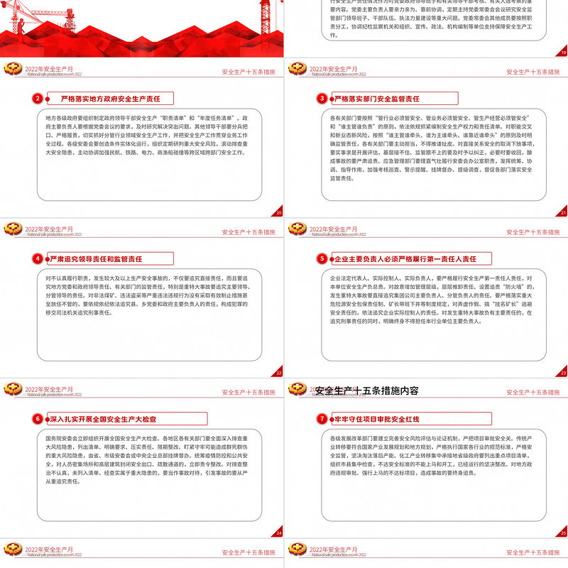 2各地區、各有關部門和單位要廣泛開展安全生產法主題宣傳活動,督促企業法定代表人、實際控制人、實際負責人自覺把安全放在第一位,貫穿工作全過程各方面,切實擔起安全生產"第一責任人"責任,嚴格履行安全生產法規定的7項職責,帶頭尊法、學 法、守法,主動研判風險、排查隱患,向職代會報告安全生產工作情 況,認真組織開展全員應急救援演練和知識技能培訓,積極參加 "第一責任人安全倡議書"活動。加大以案釋法和以案普法的宣傳力度,對企業主體責任落實不到位被實行"一案雙罰"的執法案例、 安全生產行刑銜接的典型案例,以及因發生生產安全事故構成重大責任事故罪的典型案例,加大曝光力度,形成輿論聲勢。廣泛開展"我是安全吹哨人""查找身邊的隱患"等活動,調動職工參與監 督企業和主要負責人落實安全生產責任的主動性和自覺性。·學習2022年全國安全生產月通知