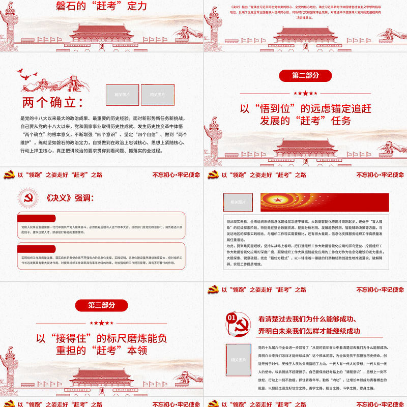 <p>學習“決議”心得體會>>>以“領跑”之姿走好“趕考”之路<<<</p><br><p>前言黨的十九屆六中全會對黨的百年奮斗重大成就和歷史經驗進行了全面系統總結,審議通過了《中共中央關于黨的百年奮斗重大成就和歷史經驗的決議》(以下簡稱《決議》),這是黨的十九屆六中全會的重要歷史貢獻。作為一名組工干部,要以“走在前做表率”的姿態將全會精神特別是《決議》學深悟透,不斷激發信仰、啟迪智慧、汲取力量,練就“真功夫”“硬本領”,走好新時代“趕考”之路。</p><br><p>目 錄以“悟到位”的遠慮錨定追趕發展的“趕考”任務以“接得住”的標尺磨煉能負重擔的“趕考”任務以“干到底”的韌勁提振奮勇前行的“趕考”狀態第二部分第三部分第四部分第一部分以“學到底”的恒心錘煉堅如磐石得“趕考”定力contents</p><br><p>第一部分以“學到底”的恒心錘煉堅如磐石的“趕考”定力</p><br><p>★政治定力,是黨員干部思想信念的壓艙石★《決議》指出“黨確立習近平同志黨中央的核心、全黨的核心地位,確立習近平新時代中國特色社會主義思想的指導地位,反映了全黨全軍全國各族人民共同心愿,對新時代黨和國家事業發展、對推進中華民族偉大復興歷史進程具有決定性意義。★是人生方向的風向標,是干事創業的定盤星★</p><br><p>兩個確立:是黨的十八大以來最大的政治成果、最重要的歷史經驗。面對新形勢新任務新挑戰,自己要從黨的十八大以來,黨和國家事業取得歷史性成就、發生歷史性變革中體悟“兩個確立”的根本意義,不斷增強“四個意識”、堅定“四個自信”、做到“兩個維護”,練就堅如磐石的政治定力,自覺做到在政治上忠誠核心、思想上緊隨核心、行動上捍衛核心,真正把講政治的要求貫穿到看問題、抓落實的全過程。相關圖片相關圖片</p><br><p>第二部分以“悟到位”的遠慮錨定追趕發展的“趕考”任務</p><br><p>以“領跑”之姿走好“趕考”之路《決義》強調:黨和人民事業發展需要一代代中國共產黨人接續奮斗,必須抓好后繼有人這個根本大計。組織部門是黨的政治部門,肩負著選干部配班子、建隊伍聚人才、抓基層打基礎的重要使命。實現組織工作高質量發展、落實肩負職責使命離不開強有力的信息化支撐。實踐證明,信息化建設雖然建設難度較大,但對組織工作長遠發展具有重大促進作用,對提高組織工作效率具有事半功倍的效果,對加強組織工作規范管理,具有不可替代的作用。</p><br><p>以“領跑”之姿走好“趕考”之路但從現實來看,全市組織系統信息化建設層次還不夠高,大數據智能化應用才剛剛起步,還處于“盲人摸象”的初級探索階段,特別是在整合數據資源、挖掘分析利用、發展趨勢預測、智能輔助決策等方面,與發達地區的探索實踐相比,與組織工作現實需要相比,還有很大差距,信息化支撐服務組織工作高質量發展任重道遠。為此,要聚焦問題短板,堅持從戰略上著眼,把打通組織工作大數據智能化應用的孤島壁壘、挖掘組織工作大數據智能化應用的深度廣度,凝聚組織工作大數據智能化應用的工作合力作為信息化建設的發力重點,大膽探索、銳意破題,找出“最優方程式”,以一錘接著一錘敲的釘勁和韌勁創造性地推進落實、破解障礙,實現工作提質增效。相關圖片</p><br><p>第三部分以“接得住”的標尺磨煉能負重擔的“趕考”本領</p><br><p>以“領跑”之姿走好“趕考”之路看清楚過去我們為什么能夠成功、弄明白未來我們怎樣才能繼續成功黨的十九屆六中全會進一步回答了“從黨的百年奮斗中看清楚過去我們為什么能夠成功、弄明白未來我們怎樣才能繼續成功”這個根本問題,為全體黨員干部擔當歷史使命,創造無愧于時代、無愧于人民的業績指明了方向。一代人有一代人的夢想,一代人有一代人的使命。軟肩膀挑不起硬擔子。自己要保持趕考路上的“清醒意識”,思想上一刻不放松,行動上一刻不放緩,抓住青春年華,勤練“內功”,讓增長本領成為青春搏擊的能量,以昂揚之姿走好信念之路、善學之路、擔當之路、斗爭之路、修身之路。相關圖片</p><br><p>以“領跑”之姿走好“趕考”之路堅持提高政治能力,著力提高政治敏銳性和政治鑒別力,學會透過現象看本質,做到胸懷“國之大者”要堅持提高政治能力,著力提高政治敏銳性和政治鑒別力,學會透過現象看本質,做到胸懷“國之大者”,用頭頂天的丘壑之志和立地氣的實事求是書寫人生答卷。要增強業務能力,深學細悟習近平總書記關于黨的建設和組織工作重要講話精神,學習干部人事檔案、組織工作信息化建設等政策法規知識,在學中干、干中學,努力成為解決問題、推動落實的行家里手。相關圖片</p><br><p>以“領跑”之姿走好“趕考”之路提高斗爭能力,既不搞迎合取悅,也不搞“你好我好大家好”,做八面玲瓏的“好好先生”要提高斗爭能力,既不搞迎合取悅,也不搞“你好我好大家好”,做八面玲瓏的“好好先生”,在大是大非面前敢于亮劍、在矛盾困難面前敢于挺身,在歪風邪氣面前敢于較真,保持共產黨人應有的風骨、氣節和膽魄。要樹立良好作風,養成嚴謹細致、精益求精、事不推諉的工作習慣,做到“文經我手無差錯,事交我辦請放心”;要增強群眾觀點,把“我是誰、為了誰、依靠誰”鑄入靈魂深處、落到點點滴滴;要從《決定》字里