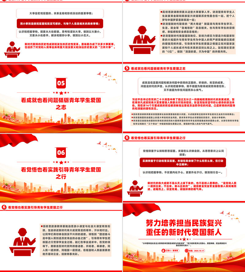 看覺悟也看實踐引導青年學生愛國之行6覺悟側重于認知和思想層面,關鍵在認識體會到,從思想意識上認同接受;實踐側重于行動和落實層面,關鍵在具體做了什么和怎么做,在行動中見精神;認識和把握事物,不僅要內化于心,更要外化于行,做到知行合一。新時代的偉大成就不是從天上掉下來的,也不是別人恩賜的,“是黨和人民一道拼出來、干出來、奮斗出來的”,凝結著全黨全軍全國各族人民知難而進、迎難而上、攻堅克難、頑強拼搏的精氣神。