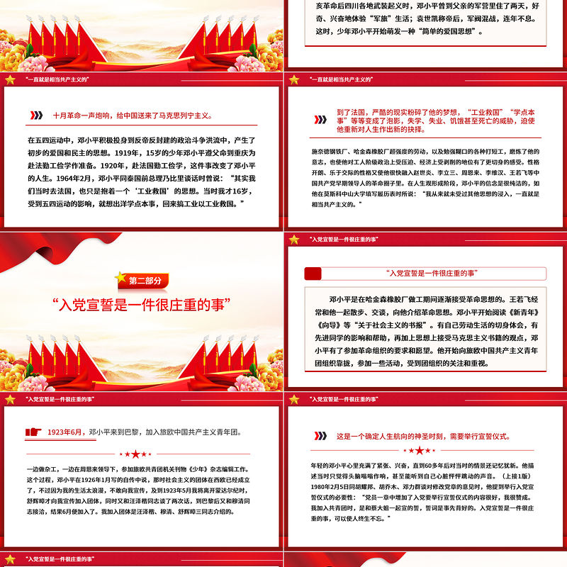 “入黨宣誓是一件很莊重的事” 鄧小平是在哈金森橡膠廠做工期間逐漸接受革命思想的。王若飛經(jīng)常和他一起散步、交談,向他介紹革命思想。鄧小平開始閱讀《新青年》《向?qū)А返取瓣P(guān)于社會(huì)主義的書報(bào)”。有自己勞動(dòng)生活的切身體會(huì),有先進(jìn)同學(xué)的影響和幫助,再加上思想上接受馬克思主義書籍的觀點(diǎn),鄧小平有了參加革命組織的要求和愿望。他開始向旅歐中國(guó)共產(chǎn)主義青年團(tuán)組織靠攏,參加一些活動(dòng),受到團(tuán)組織的關(guān)注和重視。