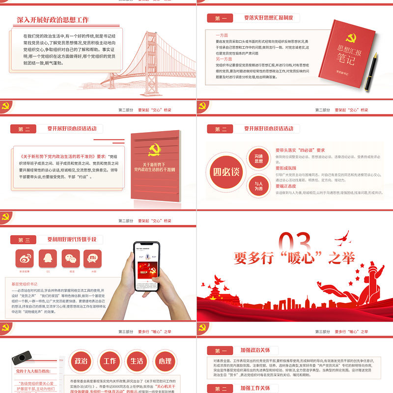 第三部分 要多行“暖心”之舉“各級黨組織要關心愛護基層干部,主動為他們排憂解難。”黨的十九大報告指出:市委常委會高度重視落實黨內關懷政策,研究出臺了《關于規范慰問工作的實施辦法(試行) 》。市委書記XXXX同志在上任伊始,就作出“關心機關干部身體健康,多組織一些體育活動”的批示,經常到一線黨支部駐地看望慰問黨員干部,與青年干部、上掛鍛煉干部座談,在政治、工作、生活、心理等方面對黨員干部進行激勵、關心和幫助,不斷激發出廣大黨員的政治熱情和工作動力。基層黨組織書記要緊跟市委決策部署,切實做好廣大黨員的暖心工作。