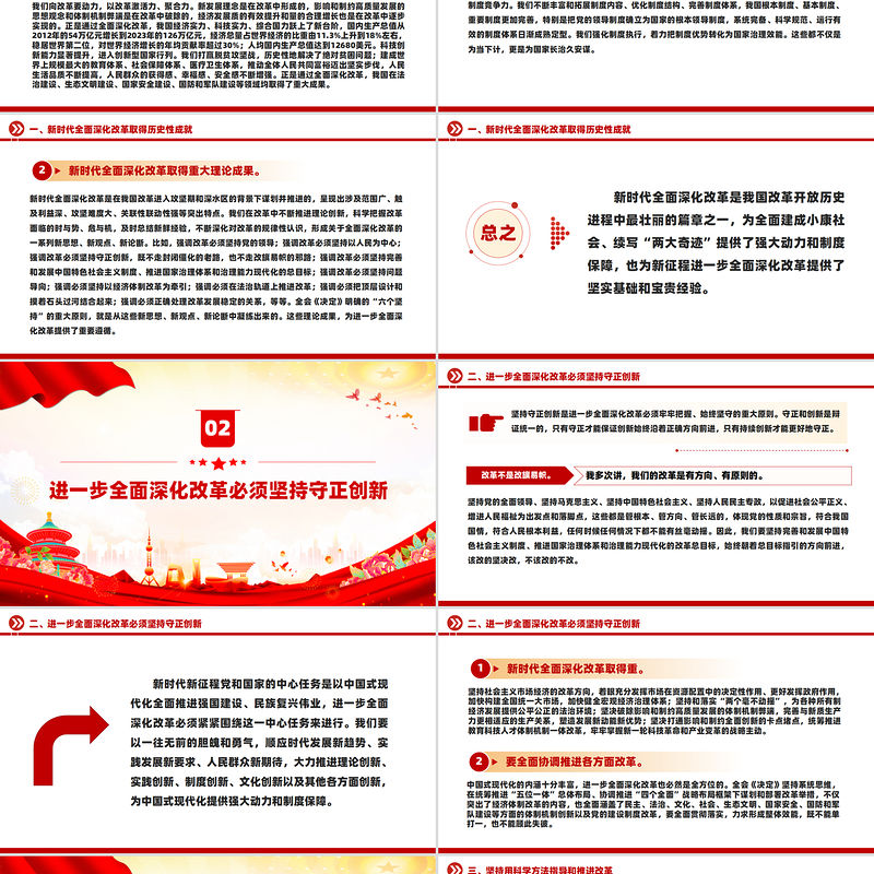 一、新時代全面深化改革取得歷史性成就新時代全面深化改革是在我國改革進入攻堅期和深水區(qū)的背景下謀劃并推進的,呈現(xiàn)出涉及范圍廣、觸及利益深、攻堅難度大、關聯(lián)性聯(lián)動性強等突出特點。我們在改革中不斷推進理論創(chuàng)新,科學把握改革面臨的時與勢、危與機,及時總結新鮮經(jīng)驗,不斷深化對改革的規(guī)律性認識,形成關于全面深化改革的一系列新思想、新觀點、新論斷。比如,強調改革必須堅持黨的領導;強調改革必須堅持以人民為中心;強調改革必須堅持守正創(chuàng)新,既不走封閉僵化的老路,也不走改旗易幟的邪路;強調改革必須堅持完善和發(fā)展中國特色社會主義制度、推進國家治理體系和治理能力現(xiàn)代化的總目標;強調改革必須堅持問題導向;強調必須堅持以經(jīng)濟體制改革為牽引;強調必須在法治軌道上推進改革;強調必須把頂層設計和摸著石頭過河結合起來;強調必須正確處理改革發(fā)展穩(wěn)定的關系,等等。全會《決定》明確的“六個堅持”的重大原則,就是從這些新思想、新觀點、新論斷中凝練出來的。這些理論成果,為進一步全面深化改革提供了重要遵循。