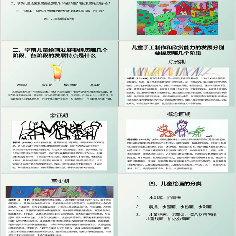 涂鴉期寫實(shí)期概念畫期象征期二、學(xué)前兒童繪畫發(fā)展要經(jīng)歷哪幾個(gè)階段、各階段的發(fā)展特點(diǎn)是什么 兒童繪畫發(fā)展是一個(gè)連續(xù)的過程,但各個(gè)發(fā)展階段不可能嚴(yán)格地劃分出明確的界限。然而在迅速變化的時(shí)期兒童表現(xiàn)出較為明顯的差異特征,因而可以相對(duì)地劃分出一定階段,每一階段都以不同的速度從前一階段中預(yù)示和產(chǎn)生出來,又過渡到下一個(gè)階段并對(duì)它起作用。