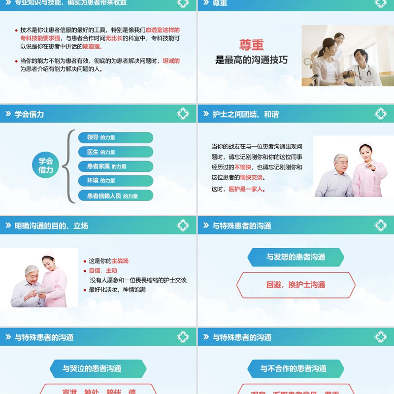 護士之間團結、和諧當你的戰友在與一位患者溝通出現問題時,請忘記剛剛你和你的這位同事經歷過的不愉快,也請忘記剛剛你和這位患者的愉快交談。這時,醫護是一家人。