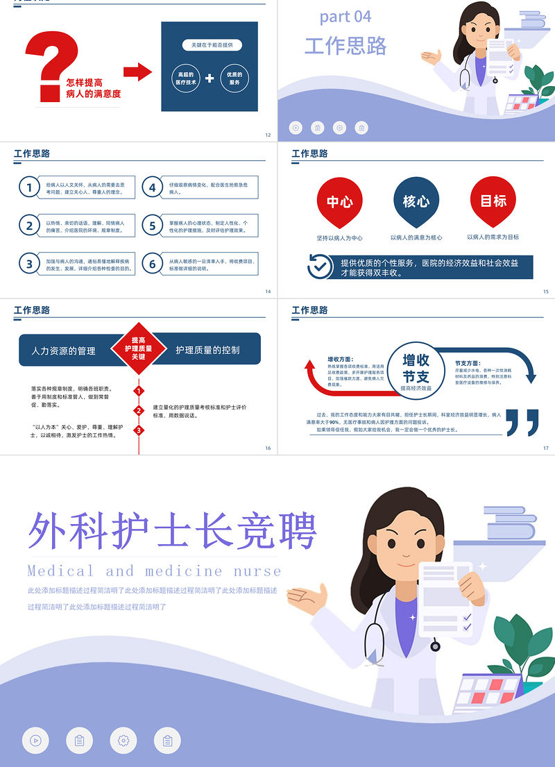工作思路提高護理質量關鍵落實各種規章制度,明確各班職責。善于用制度和標準管人,做到常督促、勤落實。建立量化的護理質量考核標準和護士評價標準,用數據說話。“以人為本”關心、愛護、尊重、理解護士,以誠相待,激發護士的工作熱情。