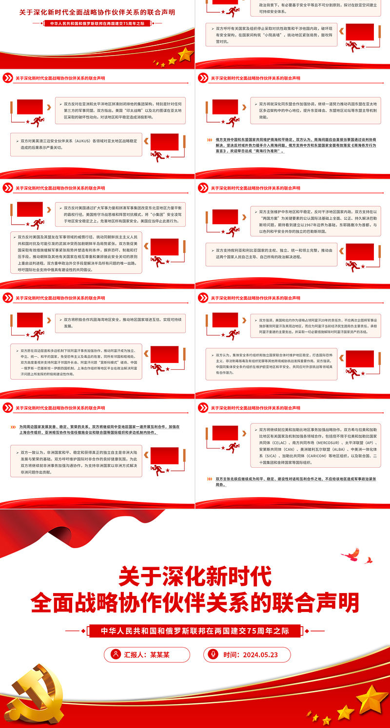 中俄關于深化新時代全面戰略協作伙伴關系的聯合聲明PPT精美簡潔中俄建交75周年黨課