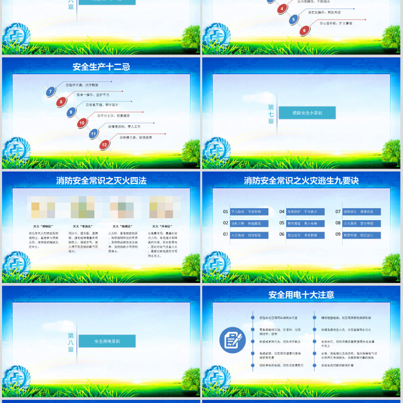 安全用電十大注意保險絲切忌用銅絲或鐵絲代替更換或擦拭燈泡、燈管時,切忌用濕手、濕布檢修或更換燈頭,切忌用手觸及電線破損,切忌用傷濕膏代替絕緣膠布包裹切削帶電的電線,切忌用普通剪刀鋪設墻壁暗線,切忌用單根電線或軟線如遇電器發生火災,切忌直接用水滅火安裝臺燈,切忌將鎮流器直接固定在金屬外殼上臺扇、落地扇以及洗衣機、電冰箱等電氣切忌用兩孔電源插頭,并要安裝可靠的地線安裝電流過載切斷保護器