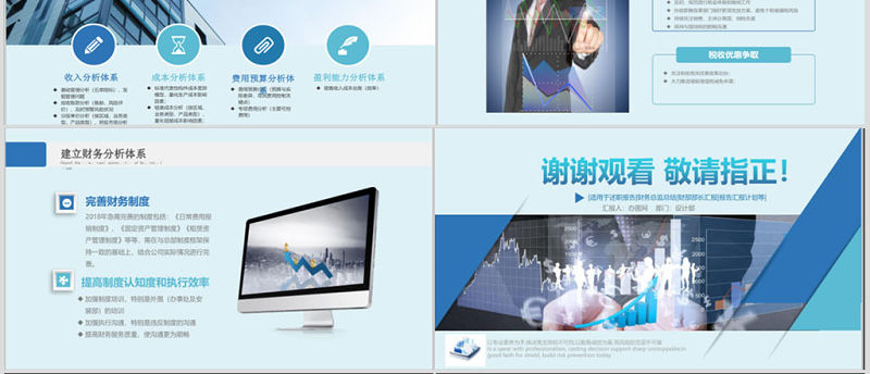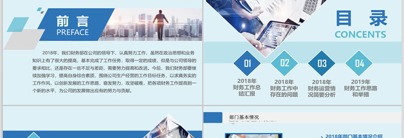 前 言PREFACE 2018年,我們財務部在公司的領導下,認真努力工作,雖然在政治思想和業務知識上有了很大的提高,基本完成了工作任務,取得一定的成績,但是與公司領導的要求相比,還是存在一些不足與差距,需要努力提高和改進。今后,我們財務部要繼續加強學習,提高自身綜合素質,圍繞公司生產經營的工作目標任務,以求真務實的工作作風,以創新發展的工作思路,奮發努力,攻堅破難,把各項財務工作提高到一個新的水平,為公司的發展做出應有的努力與貢獻。