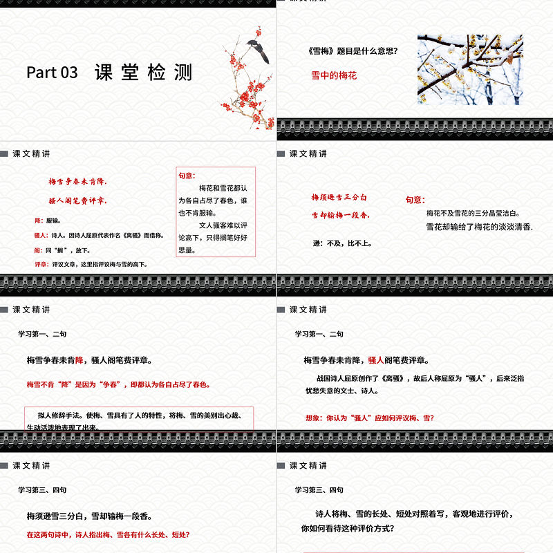 課文精講學(xué)習(xí)第一、二句梅雪爭(zhēng)春未肯降,騷人閣筆費(fèi)評(píng)章。 戰(zhàn)國(guó)詩(shī)人屈原創(chuàng)作了《離騷》,故后人稱屈原為“騷人”,后來(lái)泛指憂愁失意的文士、詩(shī)人。想象:你認(rèn)為“騷人”應(yīng)如何評(píng)議梅、雪?
