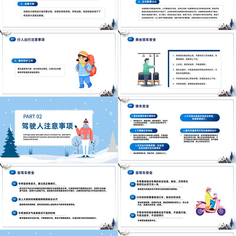 PART 01行人注意事項冬季氣溫低,雨雪多,路滑,易疲勞,給安全行車帶來諸多不便。根據冬季的氣候特點,司機要增強冬季行車安全意識,避免發生意外事故,同時日常要有針對性做好冬季汽車保養