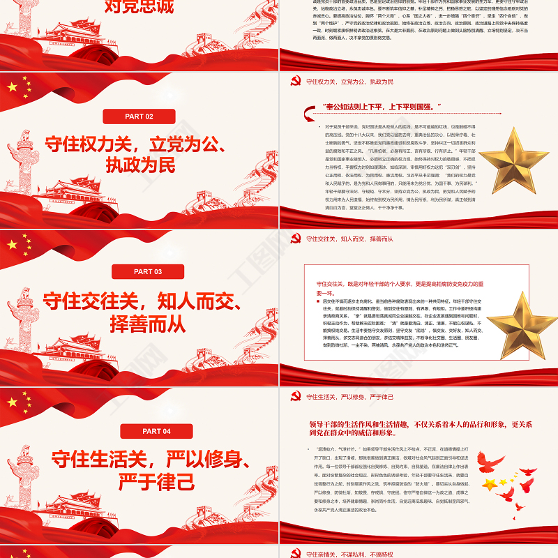 前言QIAN YAN年輕干部是黨和國家事業發展的希望,是新時代干部隊伍的中堅力量。習近平總書記高度重視年輕干部的選拔培養,黨的十九大以來,習近平總書記六次出席“中青班”開班式,親自主講“開學第一課”,為廣大年輕干部健康成長指明了前進方向,提供了根本遵循。在2022年春季學期中央黨校(國家行政學院)中青年干部培訓班開班式上,習近平總書記強調:“年輕干部必須牢記清廉是福、貪欲是禍的道理,經常對照黨的理論和路線方針政策、對照黨章黨規黨紀、對照初心使命,看清一些事情該不該做、能不能干,時刻自重自省,嚴守紀法規矩。守住拒腐防變防線,最緊要的是守住內心,從小事小節上守起,正心明道、懷德自重,勤撣‘思想塵’、多思‘貪欲害’、常破‘心中賊’,以內無妄思保證外無妄動。”生逢偉大時代的年輕干部,一定要牢記習近平總書記的諄諄囑托,堅定理想信念,牢記初心使命,恪守廉潔之本,自覺守住守牢政治關、權力關、交往關、生活關、親情關這“五關”,以實際行動彰顯共產黨人清正廉潔的政治本色,在新時代新征程上留下無悔的奮斗足跡。