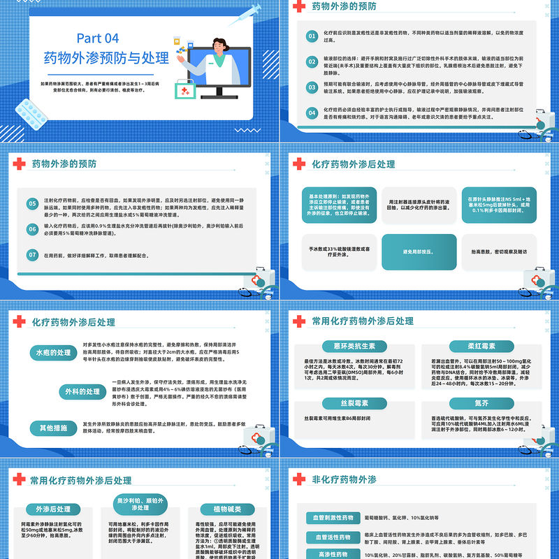 Part 04藥物外滲預防與處理如果藥物滲漏范圍較大、患者有嚴重疼痛或者滲出發生1~3周后病變部位無愈合傾向,則有必要行清創、植皮等治療。