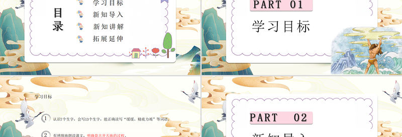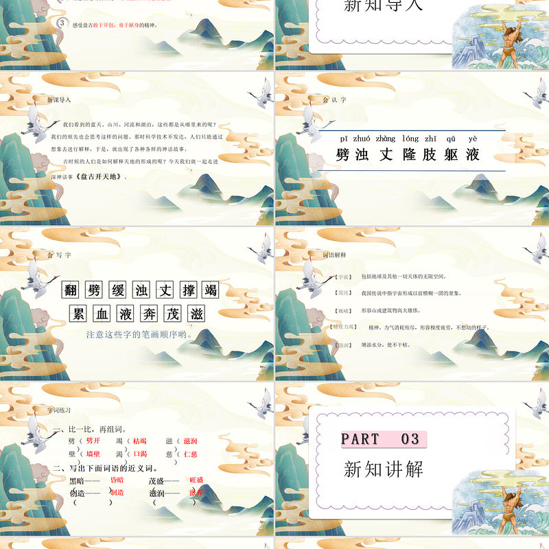 呼出的氣息——變成了四季的風和飄動的云 發出的聲音——化作了隆隆的雷聲 左眼——太陽;右眼——月亮 四肢和軀干——大地的四極和五方的名山 血液——變成了奔流不息的江河 汗毛——變成了茂盛的花草樹木 汗水——變成了滋潤萬物的雨露 ……課文解讀