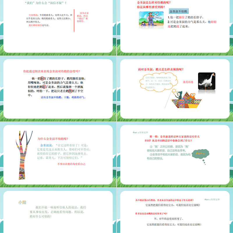 我明白了我們要從不同的角度看問題,不害怕像鵝一樣的事物,更不能欺負像牛一樣的事物。從金奎叔的話中我會對牛說:不要默默承受別人對你的欺負。從告誡牛的角度我會對鵝說:不要欺負害怕你的小動物和人。從勸誡鵝的角度Part 4 總結升華