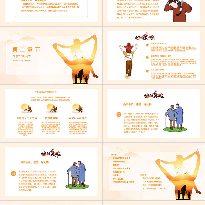 回憶與父親的點滴生活:一部由20多名警察子女參與錄制的微電影--《最可靠的人》,曾引來了許多網友關注。雖然視頻只有短短5分多鐘,但家屬們發自內心的話,讓很多人為之感動。拍攝微電影分享與父親30年來的成長"萌照",從1歲的"小米豆",到30歲的"大萌子",北京女孩趙萌萌的身邊,總有父親的陪伴,她的母親則用相機記錄了父女倆的30年。照片見證父女感情丁一晨的一組父愛漫畫爆紅網絡,讓人忍不住回憶起自己成長過程中和爸爸所發生的點點滴滴。漫畫記錄的都是成長中的故事,昨天筆下的爸爸非富也非貴,卻在用給予女兒最純粹的父愛。溫馨漫畫表達愛 中國各式各樣的祝福方式與國外人們慶祝父親節的方式不同,我國人們慶祝父親節的形式多種多樣。人們用不同的方式表達著對父親的感激之情。